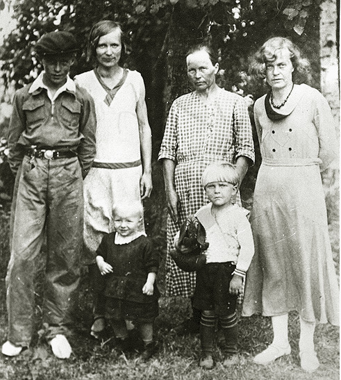 Perhekuva v. 1934. Vasemmalta: Martti, Mirja ja Irma (s. Karttunen), Miina, Pertti ja Helmi