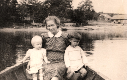 Mirja veneessä syntymäkotinsa rannassa