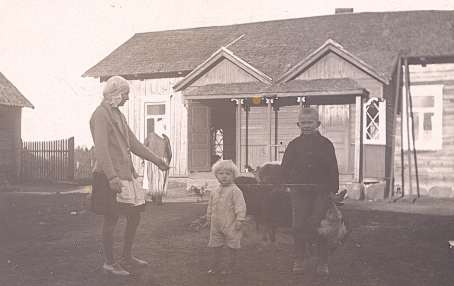 Karvasen talo. Pihalla Hilja, Antti, Paavo ja Liisa.