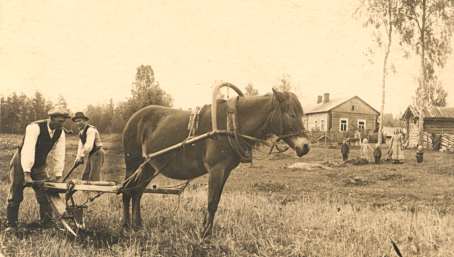 Simo kyntää, Antti kuokkii ja Liisa pesee pyykkiä. Eeva-Liisa mummo sekä lapset Hilja, Tauno, Huugo ja Urho katselevat.
