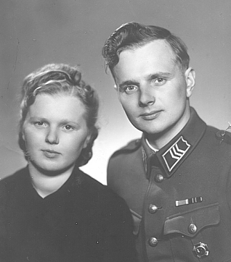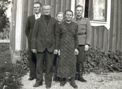 Perhekuvassa vasemmalta Eino (s. 1915), Kaapre, Lilja (s. 1923), Josefiina ja Niilo (s. 1920) Kuusanniemi. Kuvassa perhe poseeraa Orimattilan Heinämaan kylässä evakkona.