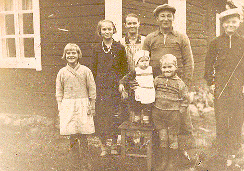 Jukan perhe kotitalonsa nurkalla v. 1938. Vas. Leena, Laila, Helvi, Jukka ja Sulo.