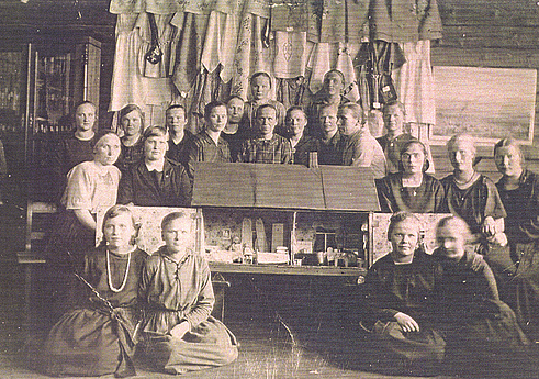 Merimieslähetyksen ompeluseuran myyjäiset Kiiskilän koululla. Nukkekodin takana keskellä ruudullisessa leningissä Olga Laakso.