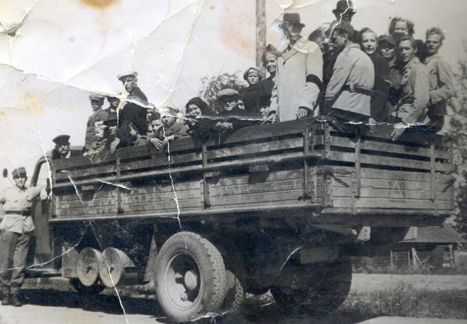 Hautajaisväkeä autossa lähdössä Pentin siunaustilaisuuteen kirkolle v. 1942.