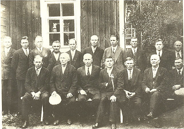 Häävieraita Peltosen pihalla. Istumassa: Juhana Vartiala, Aabel Peltonen, X, sulhanen Matti Peltonen, Tahvo Hämäläinen, Tahvana Peltonen ja Mikko Mannonen Seisomassa: X, X, X, Antton Kurki, Albert Karttunen, Santeri Hämäläinen, Mikko Hämäläinen, Mikko Peltonen, Väinö Vaitola ja X.